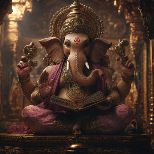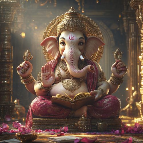 Hindu god Ganesha sitting and god have 4 hands , in two hands he holds lotus and third right hand is Bless position and fourth Left hand he holds a open book, single elephant teeth , sitting in padamasan, backdrop is Golden with lotus atmosphere, devotional and realistic images** hyper realistic cinematic look** create for YouTube video