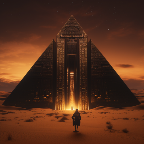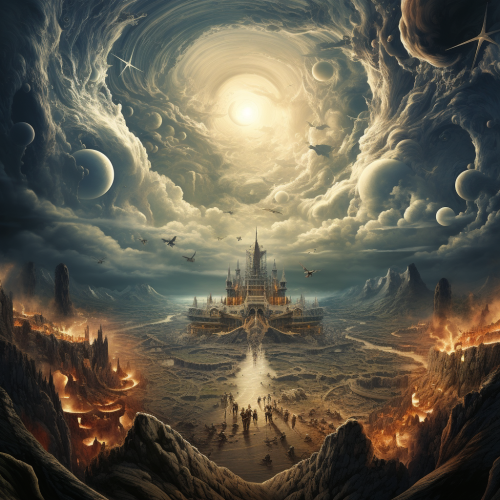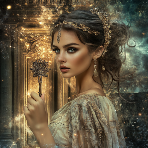 photomontage of a beautiful goddess, she is holding a key, there is a door to the 5th dimension in the background, she is tempting you to take the key