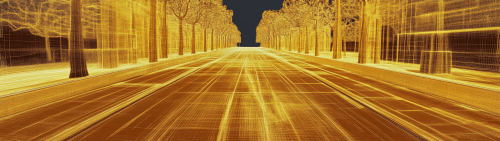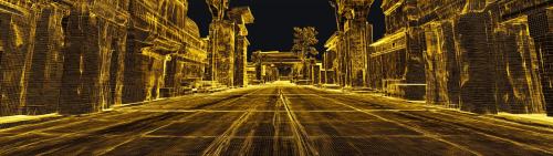 LIDAR scan point cloud of a street of the mythical city El Dorado. Designed by Frank Lloyd Wright. Golden colors. Ground level view. --quality 2 --ar 32:9 --style raw --stylize 0 --no villa