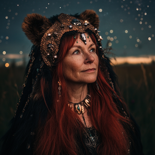 photo of a mature Celtic woman with red hair, wearing a bear headdress with bear teeth over forehead. Nightime view with starlight. She’s looking wisely into the distance.