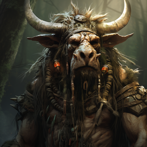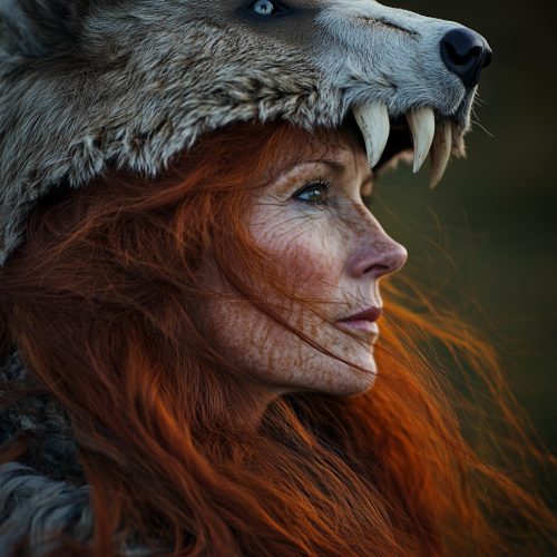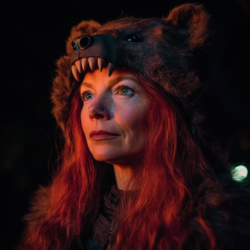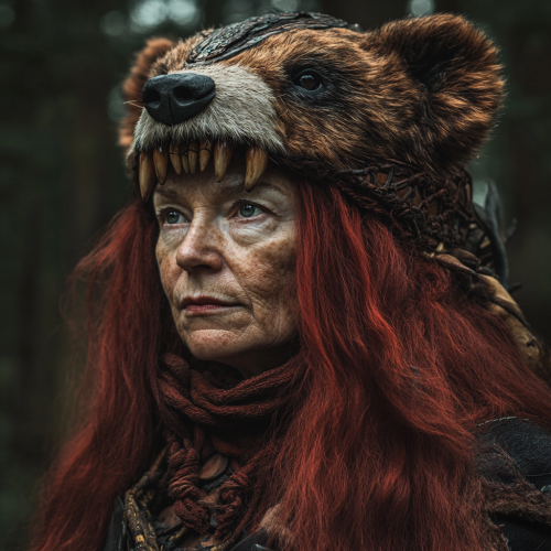 photo of a mature Celtic woman with red hair, wearing a dramatic bear headdress with bear teeth over forehead. Nightime. She’s looking wisely into the distance.