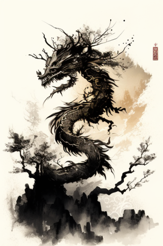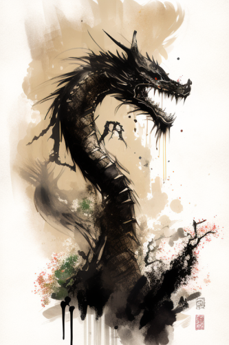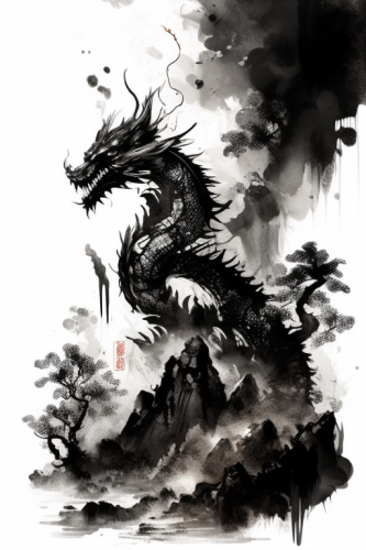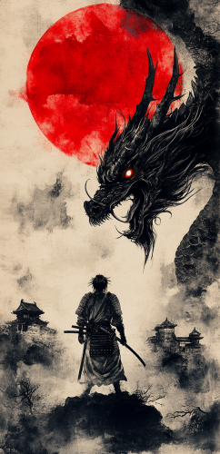A samurai in an ancient Japanese landscape, facing off against the dragon's head of darkness. The scene is set under a red sun with misty clouds. In the style of art nouveau, with traditional ink painting, Chinese brushwork, and ink wash technique, the artwork features black and gray tones, high resolution, and high detail in a full-body portrait. The dragon's eyes glow darkly. This artwork symbolizes fearlessness amidst danger and mystery, with elements like a castle or village visible behind the samurai. --ar 31:64