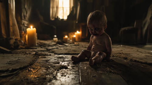 a zombie baby sitting on a filthy floor in an old house. The baby looks like a demon. In the background are candles scattered across a dark old room. --ar 16:9