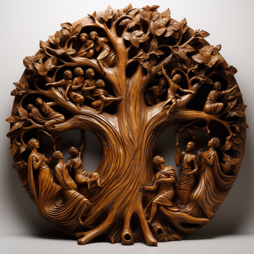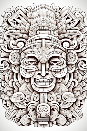 woodcut with mayan shamans and the feathered serpent round and oval frame, adult coloring book page, crisp line drawing with less details --ar 2:3 --s 250
