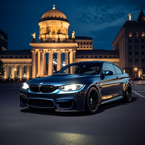 Foreground: A sleek, polished BMW M3, tinted in a luxurious shade of deep metallic gray or the signature BMW blue. The headlights should be illuminated, capturing the viewer's attention and emphasizing the vehicle's power. Midground: A historical backdrop of the Brandenburg Gate, symbolizing the rich heritage of Berlin. Light trails of cars zooming past should be added, representing the fast-paced life of the city. Background: A silhouette of the Berlin skyline during twilight, with amber and deep blue hues blending in, representing the transition from the old era to modern times. Special Element: A mythical German eagle, soaring above the skyline, symbolizing the majestic prowess and heritage of the BMW M3. Typography: Use bold, sharp fonts with a touch of elegance. The phrase "Beast of Berlin" should be prominently displayed, while a smaller caption below the car could read: "Unleashing German Engineering". Make the design in animated format like it was drawn with vibrant colors. not as if it's a picture.