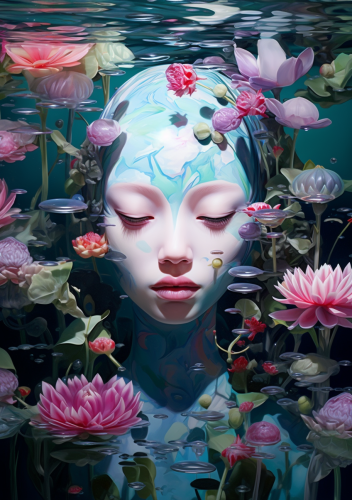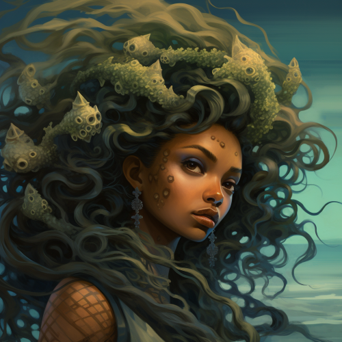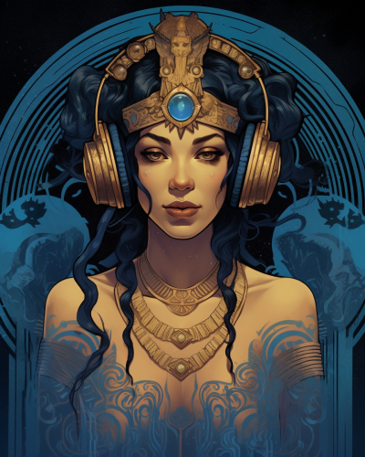 goddess wearing headphones in a tarot card, blue and black --ar 4:5 --v 5.1