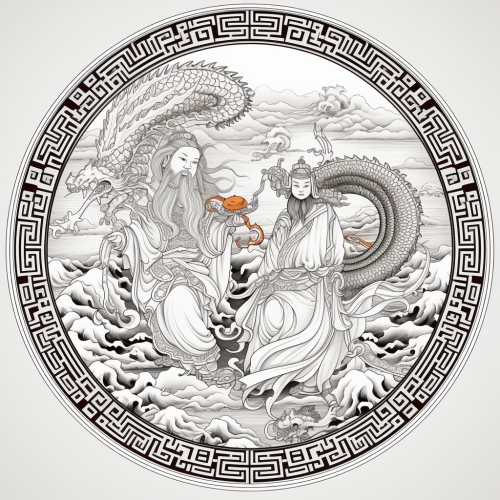 chinese woodcut with mythical figures round and oval frame, adult coloring book page, crisp line drawing with less details --s 250
