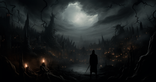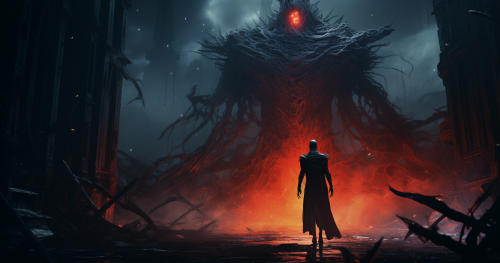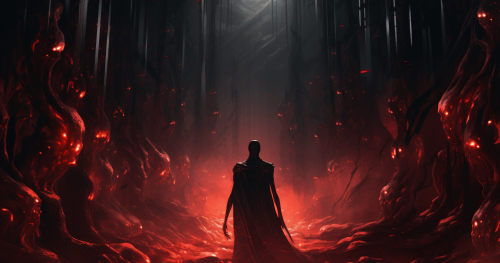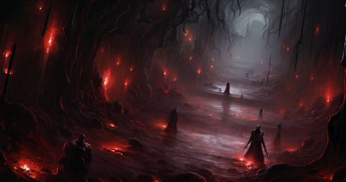cinematic Hades : an underworld filled with shadowy souls, abstract --style raw --ar 21:11