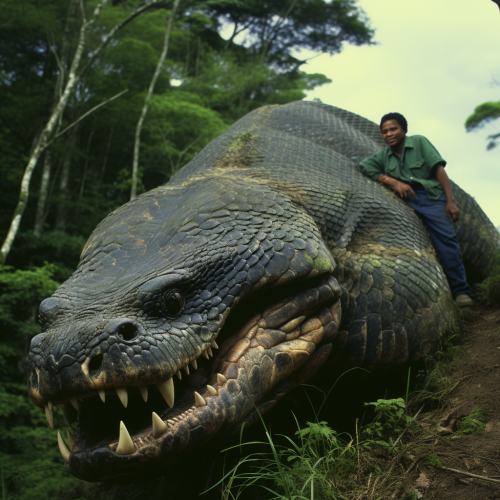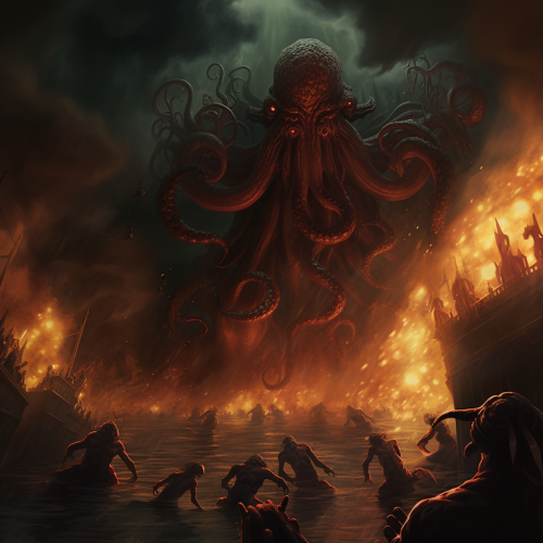 Gigante humanoide, pele com cor mesclada entre verde escuro e preto, dez cabeças, cospe fogo, par de asas gigantes, olhos flamejantes, dois braços fortes, pernas formadas por várias serpentes, fundo com vultão ativo e floresta em cinzas, nuvens escuras no céu.