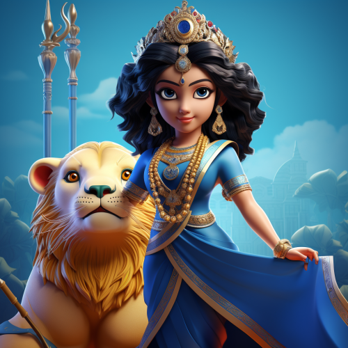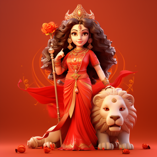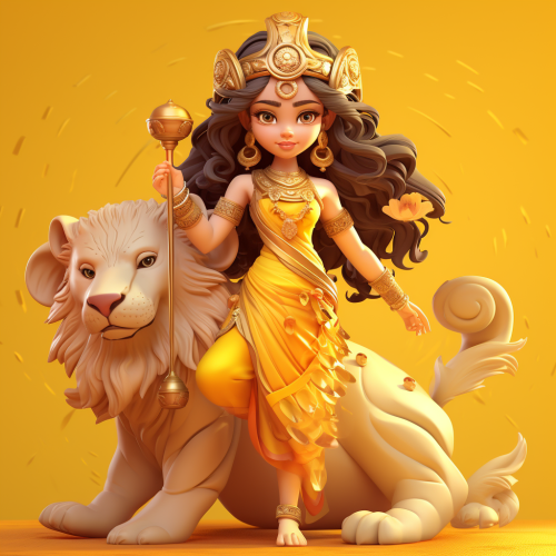 cute pixar style of lord durga wearing yellow saree with lion behind full body proportion on solid yellow plane background hyper realistic hdr superdetailed