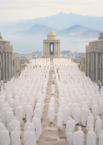 hyperlapse of devotees marching in ivory robe, a weird-looking greek temple in the background minimalistic, --ar 5:7