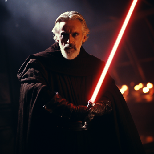 vhs screengrab, from 1982 dark fantasy film “excalibur”, count dooku with red lightsaber ignited— ar 3:2