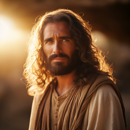 The golden light pours over Jesus, who stands in his red holy garment, with long, slightly curly brown hair, large dark eyes, double eyelids,8k v5.1