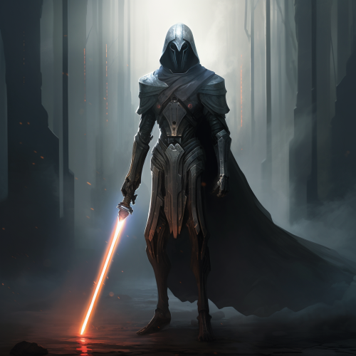 tall gray alien, wearing robotic looking armor and robes, holding a lightsaber made of darkness