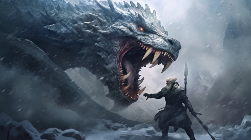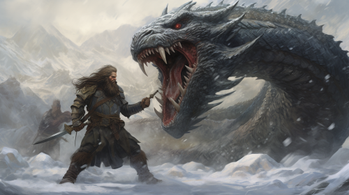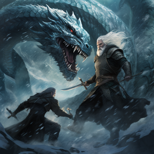 jormungandr and fenris fighting during the endless winter, norse mythology, the coming of ragnarok, highly detailed, high quality, high artistry --ar 16:9