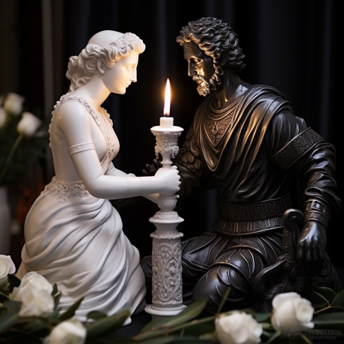 marcus aurelius statue black white classical style at a romantic table candle lit opposing the godess of love both look romantically in each other eyes, the goddess bend forward like she is under a spell of Marcus Aurelius and how attractive he is aspect 16:9