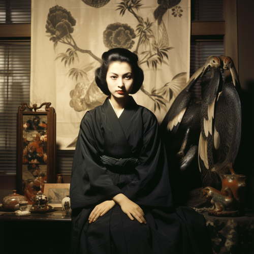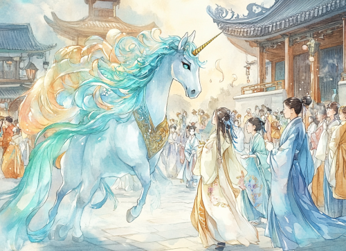 In a bustling Edo-period market, a unicorn, with a pearlescent horn and rainbow-tinted mane, weaves through a crowd of kimono-clad townsfolk who marvel at its ethereal presence. The scene captures the vibrant energy of the market, with Ukiyo-e style patterns and textures adding depth to the mythical creature's shimmering aura. --ar 11:8 --p b48zjdo --sref 3978212567