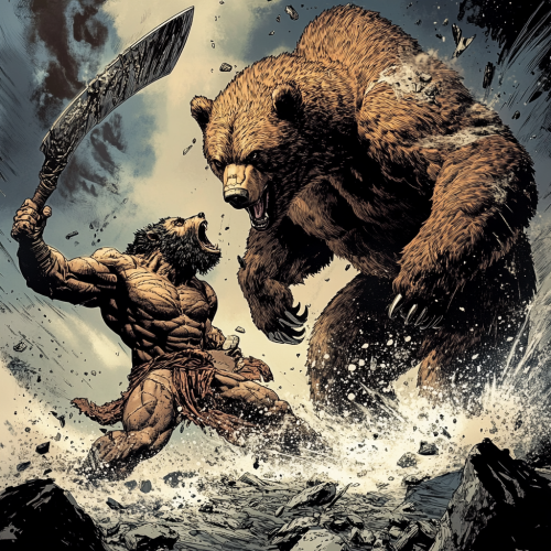 a battle between a grizzly bear and a Titan from greek mythology in comic book art. The bear should doesn’t the Chicago Bears, and the Titan should represent the Tennessee Titans