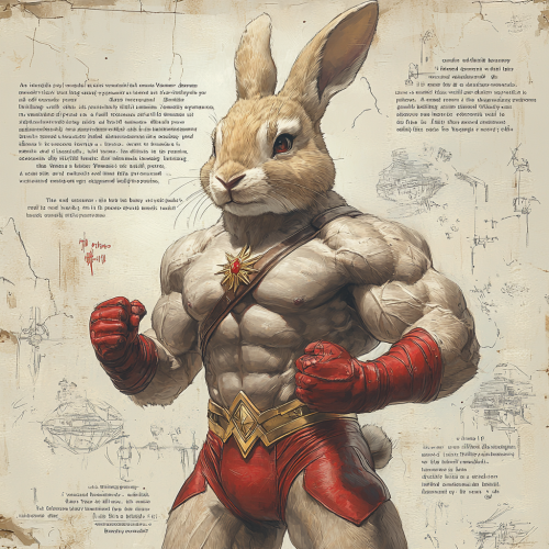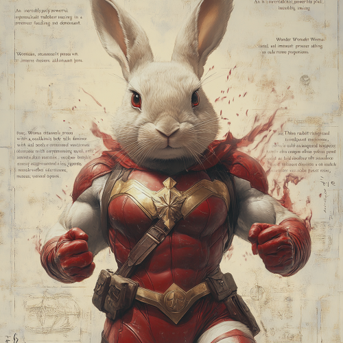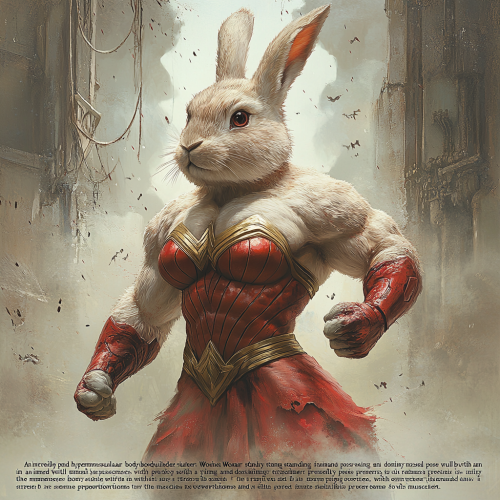"An incredibly powerful and hypermuscular bunny bodybuilder-style turned Wonder Woman, standing in a full body pose with an immensely strong and dominant presence, facing forward. The rabbit’s body is bulky to extreme proportions, with overworked muscles visible under a tight suit and short skirt , reddish-red. The costume is designed to emphasize the rabbit’s massive chest, arms and legs, with intricate details like arcane symbols and bright patterns pulsing with mystical energy. The rabbit’s thick, deer-like arms are raised, with hands shining with a chaotic red energy, ready to unleash powerful spells. His posture is broad and confident, with heavily muscular legs firmly planted on the ground, exuding strength and mystical power. The rabbit’s head is adorned with the iconic Scarlet Witch tiara, with its large muscular neck that supports it and ears that stand out through the cracks in the piece. The eyes of the bunny glow red with intense magical energy, locked in front with a fierce and determined look. The background is a mystical and turbulent landscape with floating wrecks and magical runes, highlighting the dominant and muscular form of the rabbit as a bearer of immense mystical power, embodying the essence of Wonder Woman." --s 750 --v 6.1