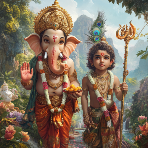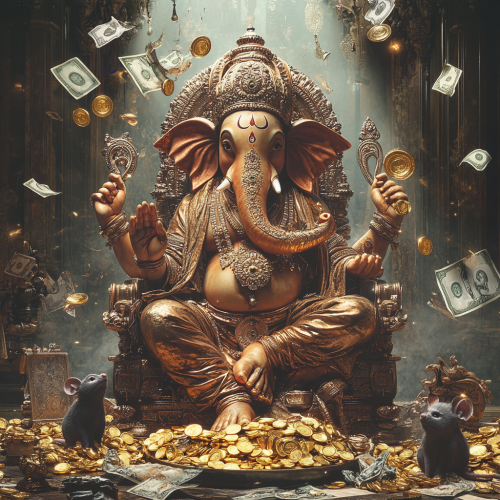 Prompt:** "Create an image of Lord Ganesha seated in a blessing pose with four arms, positioned on a large pile of gold, symbolizing wealth and prosperity. Two small divine mice are placed on either side of him, with banknotes and coins floating in the air. Ganesha is seated next to Goddess Lakshmi, who is standing while holding a lotus flower and making a gesture of bestowing wealth. The overall color scheme should be vibrant, with a pinkish sunset sky and sunlight shining from behind. The background features the cityscape of Bangkok. The composition should place Ganesha at the center of the image, with enough space around the edges for cropping. Leave space at the top for the time display on the phone."