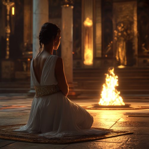 In the sacred temple of Vesta, a serene atmosphere with a central fire burning brightly. Aurelia, a beautiful Vestal priestess, kneels before the sacred flame, dressed in a pure white gown. She holds a worried expression, burdened with the responsibility of protecting Rome from a dark prophecy. hyperrealistic, cinematic, 8k