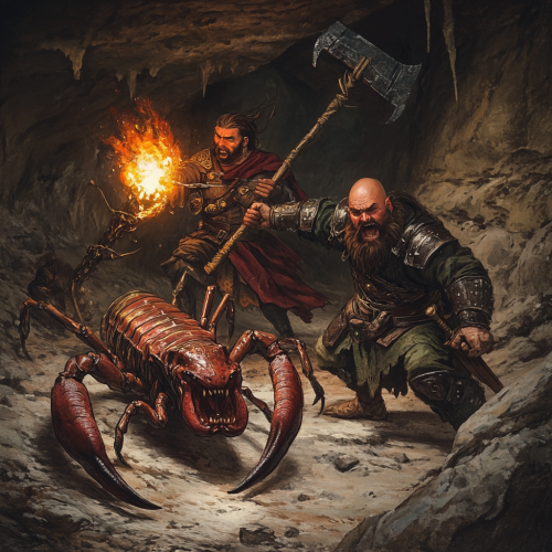 a group oftwo adventurers is battling a giant scorpion in a dark cave. One of the adventurers holds a torch in the background which is the only source of light. A human monk who is bald and wears maroon robes, battles the scorpion in front with a shortsword and fists. A male dwarf with brown hair and beard in armor wields a war hammer. --chaos 20