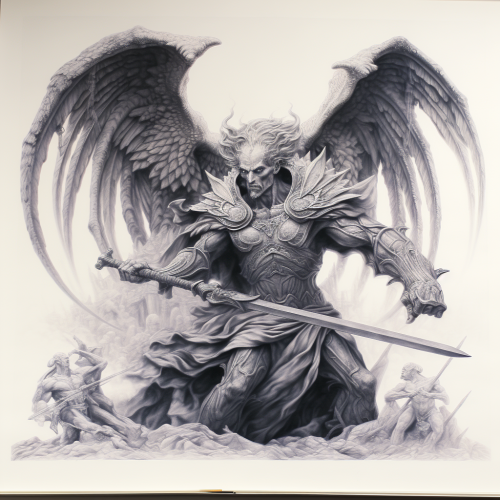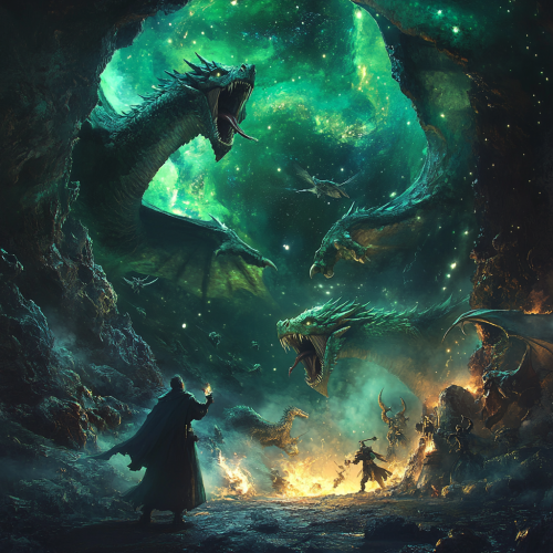 Prompt: A dark and foreboding underground passage deep within the Way of Daeros, illuminated by the flickering light of torches. The stone walls are covered in ancient dwarven runes, glowing faintly with residual magic. In the center of the scene, a fierce battle unfolds. The party of adventurers--each distinct in appearance and gear--fights valiantly against a group of hobgoblin warriors. The hobgoblins, spectral apparitions of the Slayers of Dragonspear Castle, are clad in ancient, tattered armor that still bears the marks of their long-forgotten battles. Their eyes glow with an eerie blue light, and they wield ethereal swords and axes that shimmer with ghostly energy. Some hobgoblins are leaping from elevated positions, others are charging head-on, their faces twisted with rage and vengeance. The adventurers--each exhibiting their unique abilities--are in the thick of the fight. A paladin with a glowing sword stands at the forefront, clashing with a hobgoblin warchief. Nearby, a wizard casts a spell, sending a burst of arcane energy towards a group of charging hobgoblins. A rogue, cloaked in shadows, deftly maneuvers behind an enemy, ready to strike a lethal blow. In the background, a cleric raises a holy symbol, channeling divine energy to protect their allies and repel the spectral foes. Above them, the cavern ceiling looms with jagged stalactites, and faint trails of divine light--representing the ley lines--intertwine throughout the battle, guiding the adventurers on their treacherous path. The air is filled with the sounds of clashing steel, battle cries, and the crackling energy of magic. This prompt provides a vivid description to help visualize the scene, capturing the intensity of the battle, the mystical environment of the Way of Daeros, and the [...]