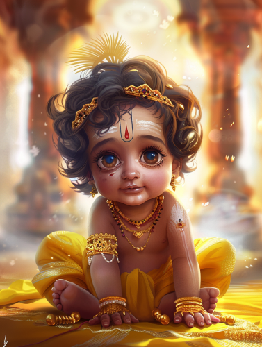 Create a hyper-realistic, adorable illustration of Baby Krishna, with large, expressive eyes and chubby cheeks. He should be depicted in a crawling position, wearing a bright yellow dhoti and adorned with gold jewelry, including a delicate crown and bracelets. His small, rounded body should be perfectly proportionate, with soft, baby-like features. The setting should be warm and glowing, perhaps inside a grand temple with soft, diffused lighting that adds a golden hue to the scene. The focus should be on the intricate details of Krishna’s features and attire, with a soft background that enhances the overall divine and tender atmosphere. --ar 3:4 --v 6.0
