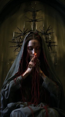 a portrait of Mary Magdalene eavesdropping through a door. on the other side it is a satanic ritual. it's raining upwards . there is a mirror. in the style of the painting: "The Madonna of Port Lligat " by "Salvador Dali"