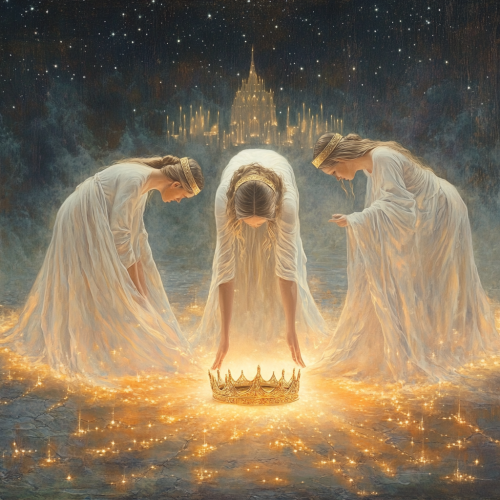 Design a Tarot card that symbolizes success and achievement. The central figure is a victorious individual standing atop a podium, holding a laurel wreath high above their head, symbolizing triumph. The figure is dressed in regal attire, with a crown or a shining light above their head, representing wisdom and enlightenment gained through success. Surrounding them are symbols of prosperity and accomplishment, such as gold coins, trophies, and a banner that reads ‘Victory.’ The background features a radiant sun, illuminating the scene with warm, golden light, suggesting a bright future and the fulfillment of goals. The card’s border is decorated with intricate patterns, featuring elements like ascending steps, stars, and other motifs that represent growth, ambition, and the culmination of hard work. The color palette is rich and uplifting, with golds, deep blues, and vibrant reds dominating the scene, conveying a sense of confidence, achievement, and positive energy