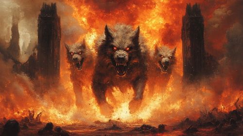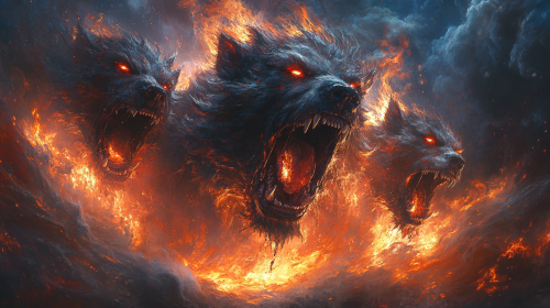 Cerberus, the three-headed guardian of Hades, standing imposingly at the gates of the Underworld, each head snarling with glowing red eyes, sharp fangs bared, and dark fur bristling – surrounded by swirling shadows and ethereal flames, with the River Styx flowing ominously behind – a fearsome, otherworldly creature, detailed and textured, dark fantasy, dramatic lighting, high contrast, ultra-realistic, menacing atmosphere --ar 16:9 --v 6.1 --s 750