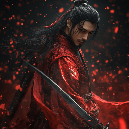 create a hyperrealistic Chinese mythological being who weilds a sword and magic. A beautiful man with long black hair and dressed in traditional Ming Dynasty robes. color palette red and black. 8K quality, ar. 12:6 dramatic lighting