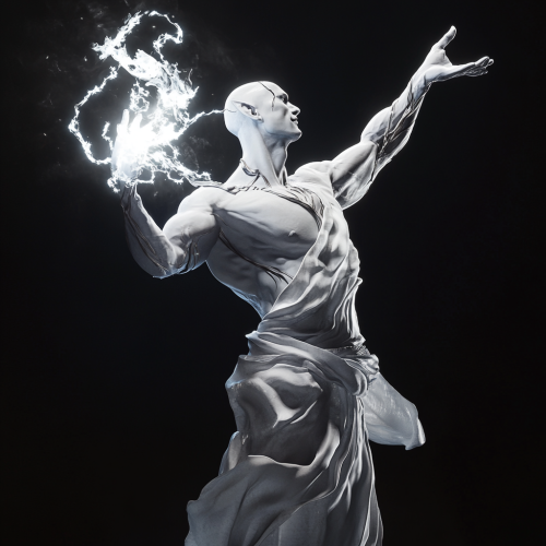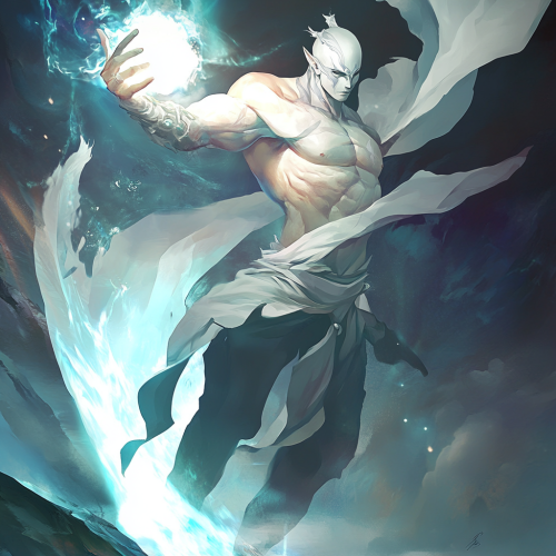 full-length deity stretching out his arm and holding a blob of light in his hand, with a white aura emanating from his body, hyper-reality style, by the Riot games --v 6.1