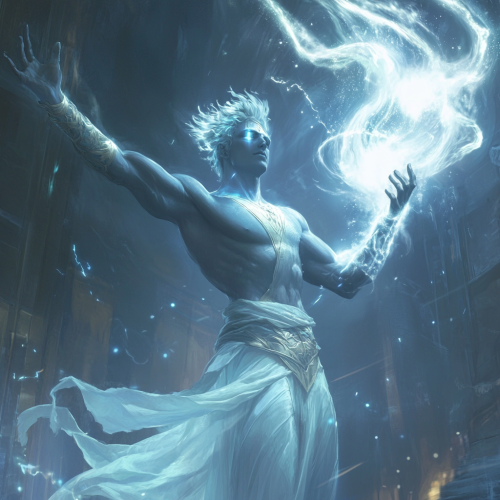 full-length deity stretching out his arm and holding a blob of light in his hand, with a white aura emanating from his body, hyper-reality style, by the Joseph Cross --v 6.1