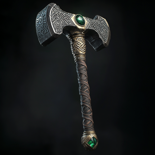 dwarven war hammer, steel, dragon skin wrapped handle, emeralds embeded into handle, emerald in the bottom of handle,, dark background, hammer head covered with runes, right side of hammer head is in shape of curved cone