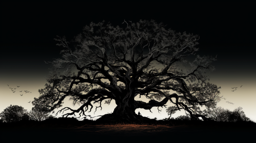 The silhouette of an enormous ash tree, like an illustration for a book of "nordiska gudar" of johan egerkans. Use dark colors, no background. Focus only in the trunk and the roots --ar 16:9 --q 0.75