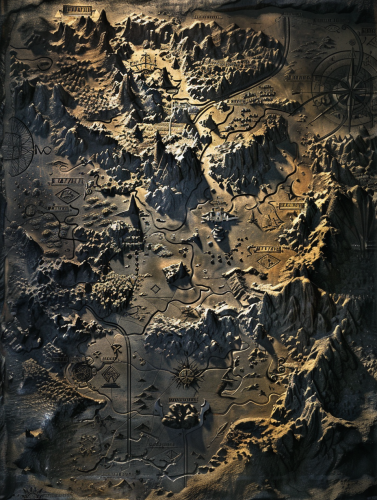 A fantasy world map etched into stone, showing sprawling kingdoms, mountain ranges, and mystical locations. The map has a rugged texture, with carved details and symbols representing various regions. Monochrome tones, dramatic lighting, deep shadows. Created Using: stone carving techniques, fantasy cartography style, chiseled details, rough textures, ancient symbols, epic scale, mythological references, solid stone background, hd quality, natural look --ar 3:4 --v 6.0