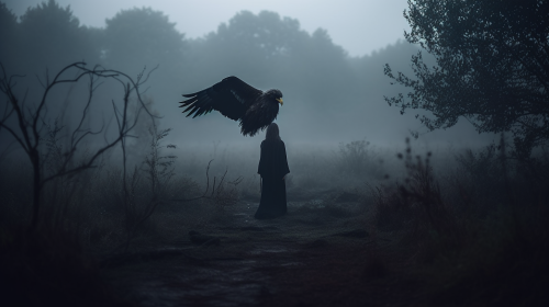 A haunting, moonlit moor with eerie fog, a woman cursed to become a harpy, her wings wrapped protectively around her, talons digging into the damp soil, the atmospheric lighting emphasizing the tragic beauty of her mythical existence, Photography, shot with a telephoto lens, --ar 16:9 --v 5.0