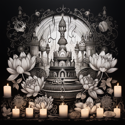 **black pen line drawing of hindu diwali features. With mandalas and lotuses, with deepa clay lanterns hindu goddess pray