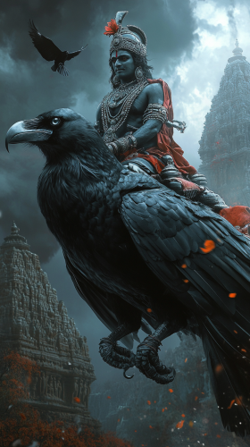 Create a stunning and majestic image of Hindu God Shani Dev, depicted in traditional black attire. Place him in an ancient, ornately designed temple The overall scene should evoke a sense of reverence and spiritual awe, capturing the grandeur and significance of Shani Dev in Hindu mythology. --ar 9:16