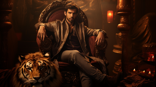 kartik aryan sitting on a throne, a tiger on the side, night, palace, epic, masterpiece, award-winning --ar 16:9