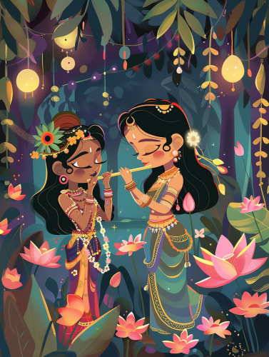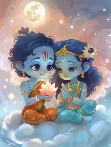 Draw a charming, chibi-style illustration of Lord Krishna and Goddess Lakshmi sitting together on a cloud. Krishna can be shown with a playful smile, holding a butter pot, while Lakshmi has a sweet, caring expression, gently holding a lotus flower. Both should have large, sparkling eyes and small, round bodies that emphasize their cuteness. The cloud can be surrounded by twinkling stars and a soft, glowing moon, creating a dreamy and serene background. The colors should be soft and pastel, with a focus on making the image feel warm and endearing --ar 3:4 --v 6.0