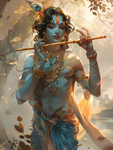 Create a highly detailed, photo-realistic illustration of Lord Krishna. He should be depicted in a serene, graceful pose, with a gentle smile and soulful eyes. His figure should be proportionate, with long, elegant fingers and feet that are perfectly formed. Krishna's traditional attire should be adorned with intricate patterns, featuring vibrant blues and golds that shimmer softly in the light. His flute should be delicately held in one hand, and a soft aura should surround him, highlighting his divine presence. The background should be a peaceful natural setting, perhaps by a tranquil river or under a sacred tree, with soft, golden light filtering through. The overall image should be sharp, well-balanced, and convey a sense of divine tranquility and grace --ar 3:4 --v 6.0