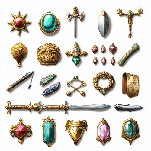 grid of 25 magical items from the dreagon's treasure stack of jewelry, gems, golden silverware and weapons, on white background, no shadows, in simplified, stylized clip-art, cartoony, pixar style