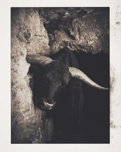a monster with the head of a bull and the body of a man who was imprisoned in a dark underground labyrinth at Knossos on the Aegean island of Crete. Old polaroid photo of a Minotaur head with a woman’s body, b&w, realistic, 4k, dark, film grain, horror core --ar 4:5 --stylize 50 --v 6.1