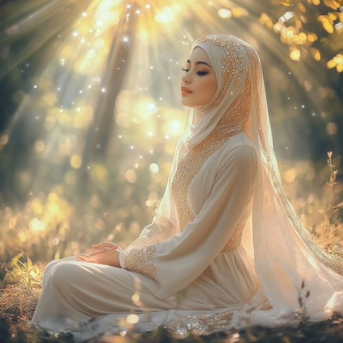 muslim concept of Hoor the most beautiful girl in Paradise in white long dress in paradise bright and wearing diamonds and gold in bright sun light with nice body brown hair and large eyes and medium size body in full body photo shoot on white bed in a white palace