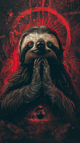 hand drawn style image with dominant black and red colors, highlighted, spiritual being, body of a sloth, only one eye, fingernails and toes big like a sloth, giant mouth on the belly, spiritual atmosphere, hand drawn style, focus on every detail, sharp details, high quality, high quality graphics, 4k, artstation --v 6.0 --ar 9:16