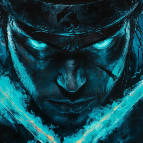 Close-up of a stern samurai with a katana gorizontally under the eyes, the katana burns turquoise flame, the flame in the form of a faint silhouette of a dragon, the flame is reflected in the eyes, on the temples of the dragon scales --v 6.1