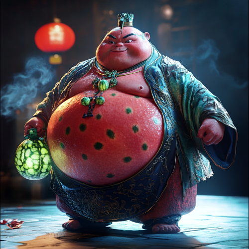 "A reimagined version of Marvel superheroes, using traditional Chinese aesthetics and presented in a realistic high-definition movie style. The villain is designed with a combination of watermelon and Chinese female ghost elements. He is very fat, has a big face, is very dark, and sparkles under the light. .Achieve depth and texture to emphasize.