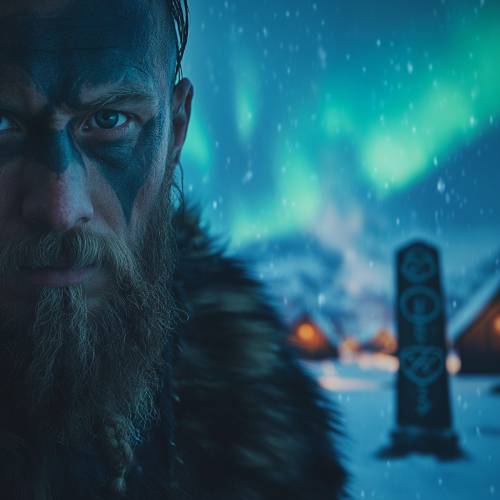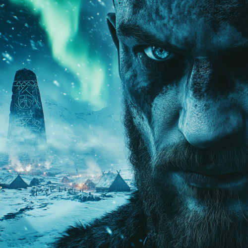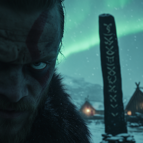 Start with a close-up, low-angle shot of a Viking warrior's intense face, eyes focused. Cut to a wide shot of a Viking settlement in a snowy landscape, smoke rising from wooden huts. Slowly zoom out to reveal a tall stone carved with Norse runes against a sky with aurora borealis. Camera pans upward to follow the glow of the Northern Lights."